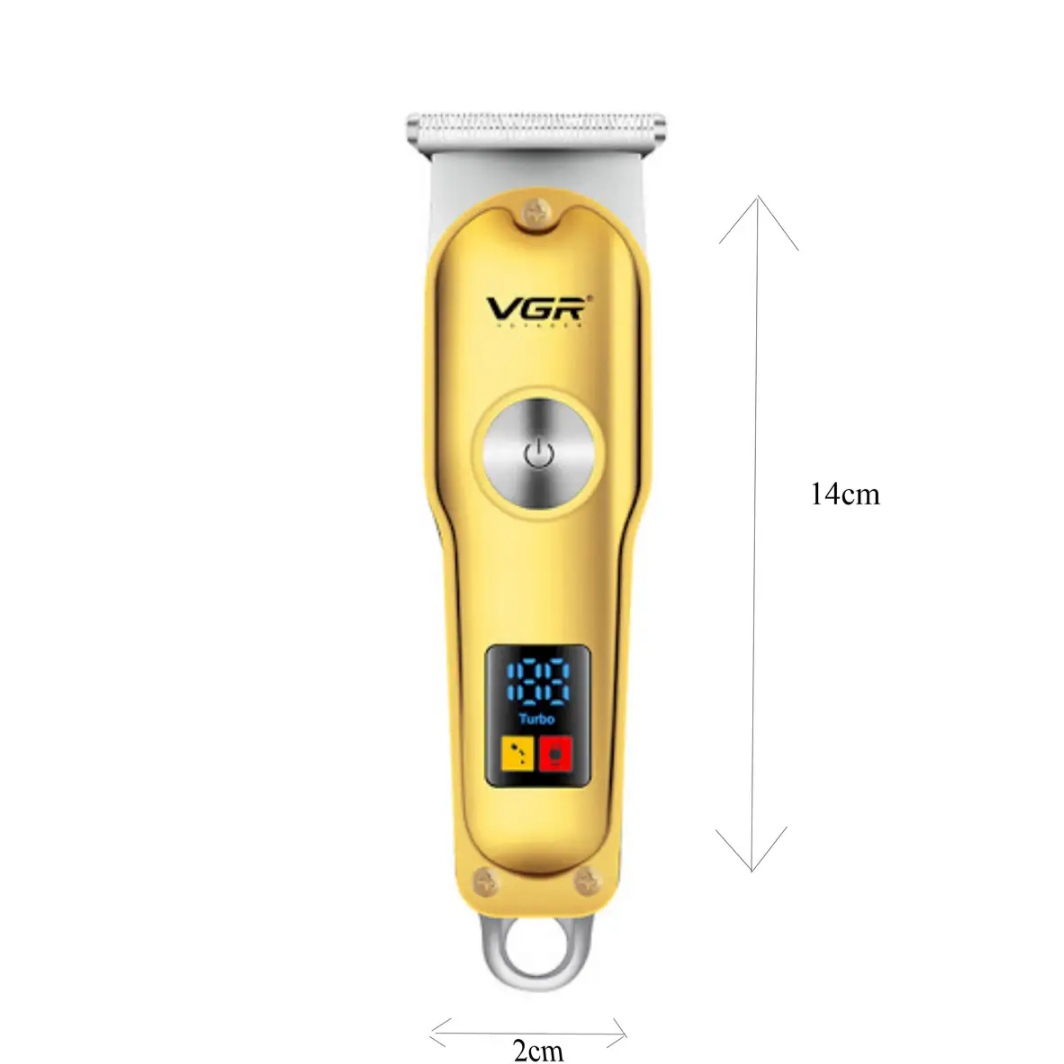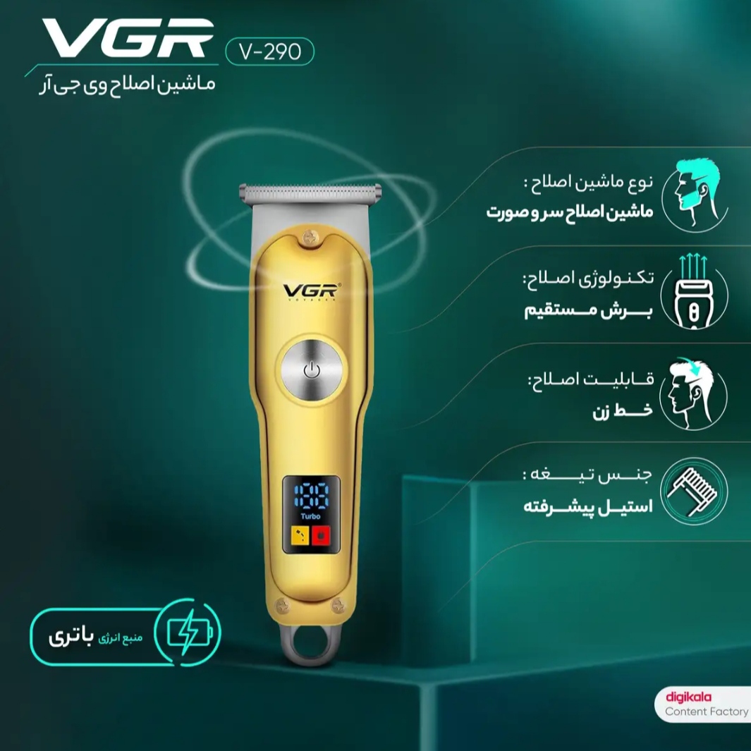 ماشین اصلاح وی جی ار یک ماشین اصلاح بسیار با کیفیت با طراحی ارگونومیک میباشد این دستگاه دارای یک نمایشگر دیجیتال میباشد که میزان شارژ دستگاه و قابلیت نیاز بودن به روغن را نشان میدهد.این ماشین اصلاح قابلیت این دوسرعته شدن دارد و همچنین قابلیت استفاده همزمان با برق و شارژ را دارد.و دارای 3 عدد شانه 1 و 2 و 3 میباشد