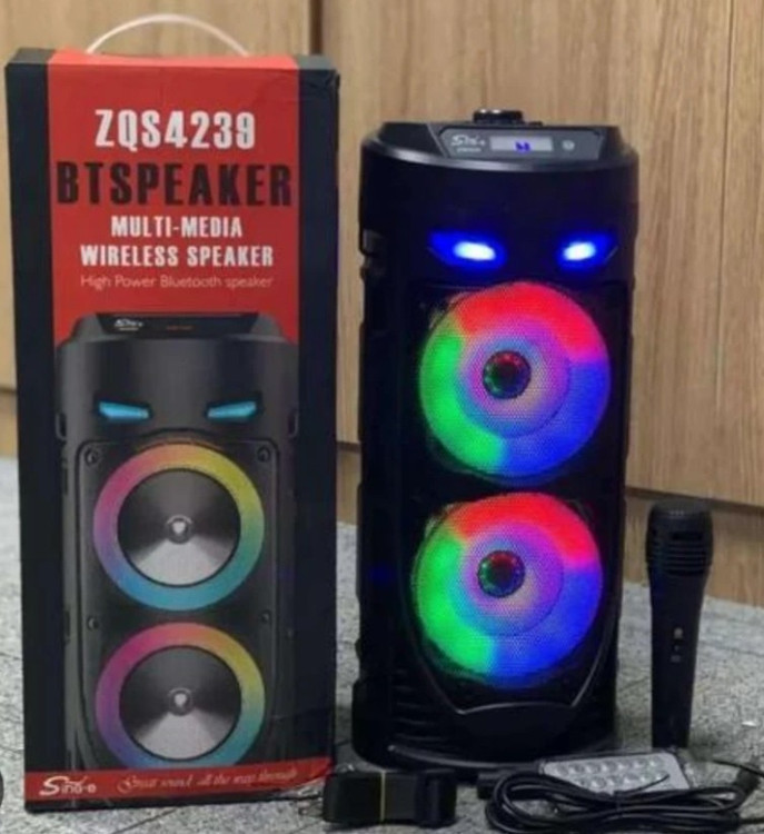 اسپیکر شارژی مدل (Zqs 4239) یکی از پرفروش ترین محصولات شرکت zqs می باشد که طراحی ظاهری خاص و جذاب این اسپیکر او را ملقب به اسپیکر چشم دار کرده است.همانند مدل های قبلی اسپیکرهای zqs با اندازه مناسب تولید شده است و همین امر آن را به همراه همیشگی شما در هر مکانی تبدیل می کند .در هر کجا که دوست دارید با روشن کردن آن، از صدای عمیق و با کیفیت لذت ببرید. بلندگوهای جدید zqs با دقت طراحی شده اند تا تجربه واقعی صدای با کیفیت را به شما ارائه دهند. این اسپیکر ها با داشتن امکاناتی همچون رقص نور جذاب و قابل تغییر، رادیو و بلوتوث ،تمام محدودیتها را برای لذت بردن از صدای واقعی و دلنشین موسیقی از بین می برند. داشتن باتری با ماندگاری بالا (۱۵۰۰ میلی آمپر ) در اسپیکر های جدید برند zqs بدان معناست که ، بیشتر از آنچه تصورش را می کنید می توانید از بودن در محیطی شاد و گوش دادن به موسیقی با کیفیت صدایی دلنشین لذت ببرید. با اتصال دستگاه به موبایل از طریق بلوتوث می توان فایل های صوتی را ازدستگاه پخش کرد.