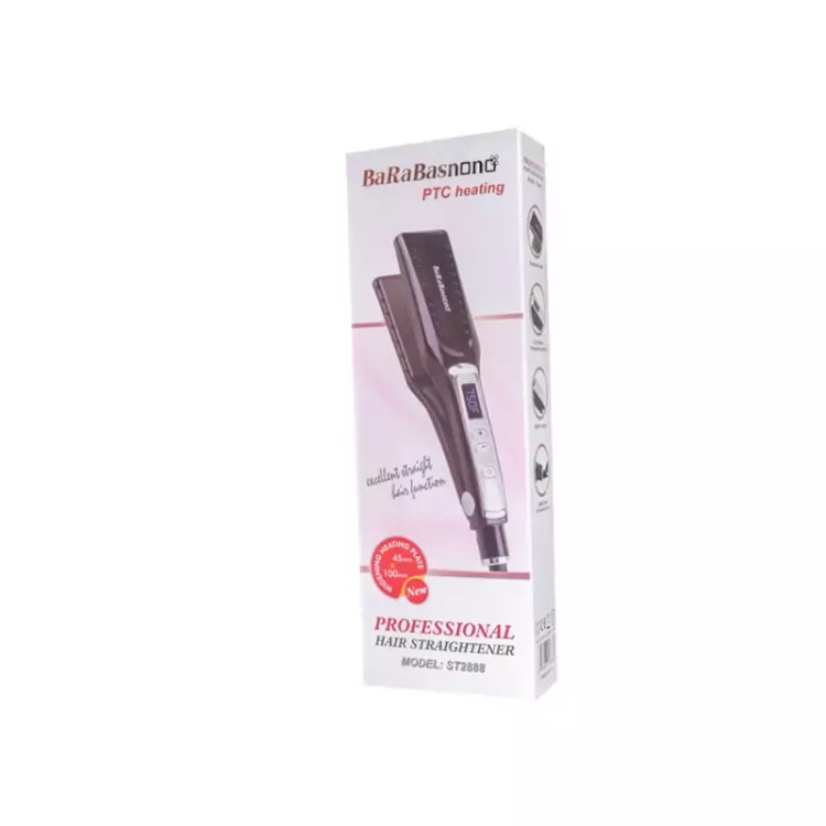 برند باراباس نانو دارای محصولات متنوع و حرفهای است که در سالنها برای آرایشگران و حتی مصرف کنندگان در منزل مناسب میباشد. اتو مو باراباس نانو مدل ST2888 محصولی با طراحی نوین که در عین زیبایی، دارای تکنولوژی پیشرفته است. دمای این اتو مو قابل تنظیم تا750 درجه فارنهایت (400 درجه سانتی گراد) می باشد که توسط نمایشگر LCD تعبیه شده بر روی دستگاه قابل مشاهده است . دکمه تنظیم دما به کاربر امکان می دهد تا درجه حرارت اتو را به دلخواه تنظیم کند. ین اتوی مو دارای صفحات آلومینیومی با قابلیت گرم شدن PTC می باشد که با افزایش دما میزان عبور جریان الکتریسیته را کاهش میدهد تا از داغ شدن بیش از اندازه صفحات اتو مو جلوگیری کند. این ویژگی مناسب افرادی است که موهای حساسی دارند و یا می خواهند حرارت کمتری را به موهای خود وارد کنند. طراحی دسته های ارگونومی و همچنین چرخش 360 درجه سیم انتهایی این امکان را فراهم میکند که مدل ST2888 علاوه بر صاف کردن مو برای حالت دادن مو نیز قابل استفاده باشد