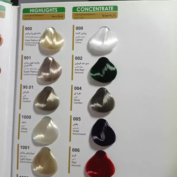 با سلام رنگ موی دورلایت کیفیت عالی 100 میل رنگ موی دورلایت با آمونیاک خیلی کم میباشد حاوی روغن آرگان،روغن زیتون ، روغن جوجوبا ،روغن ماکادمیا میباشد آبرسان و جلوگیری از خشکی و موخوره حاوی کراتین ترمیم کننده بافت کراتین مو حفظ رطوبت مو و جلوگیری از خشکی و آسیب دیدگی انها تاریخ انقضاء تاسه سال قچ