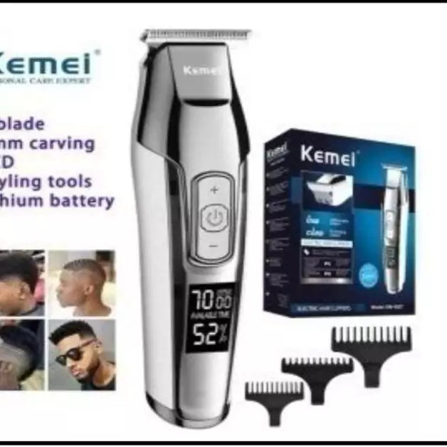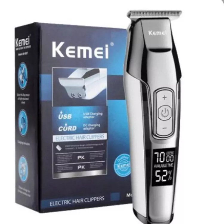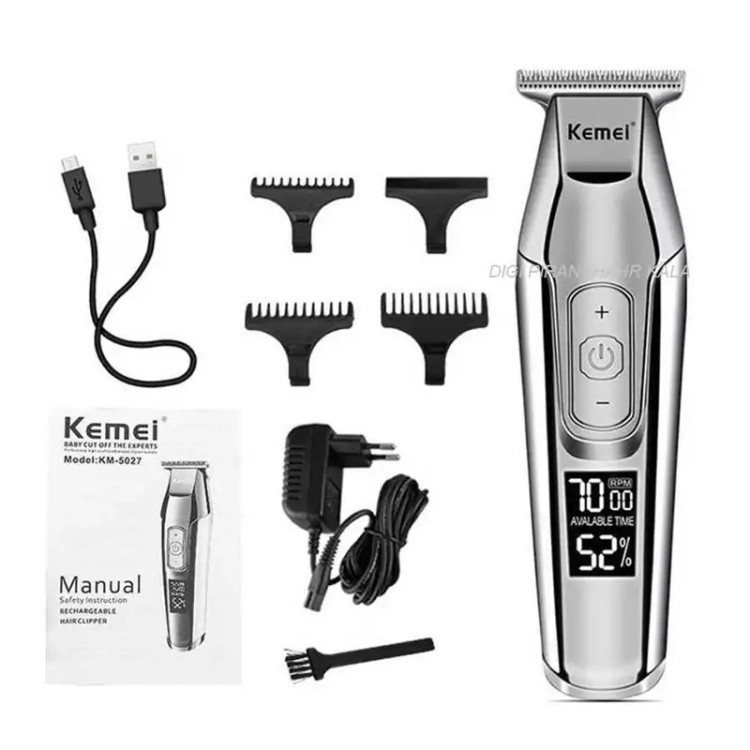 ماشین اصلاح خط زن و صفر زن کیمی مدل KEMEI KM-5027 کاربرد سالنی دارای صفحه دیجیتالی و LCD دارای تیغه تیتانیوم ضدزنگ دارای دکمه تنظیم سرعت کم و زیاد دارای سه عدد شانه به نمره های 1=2=3