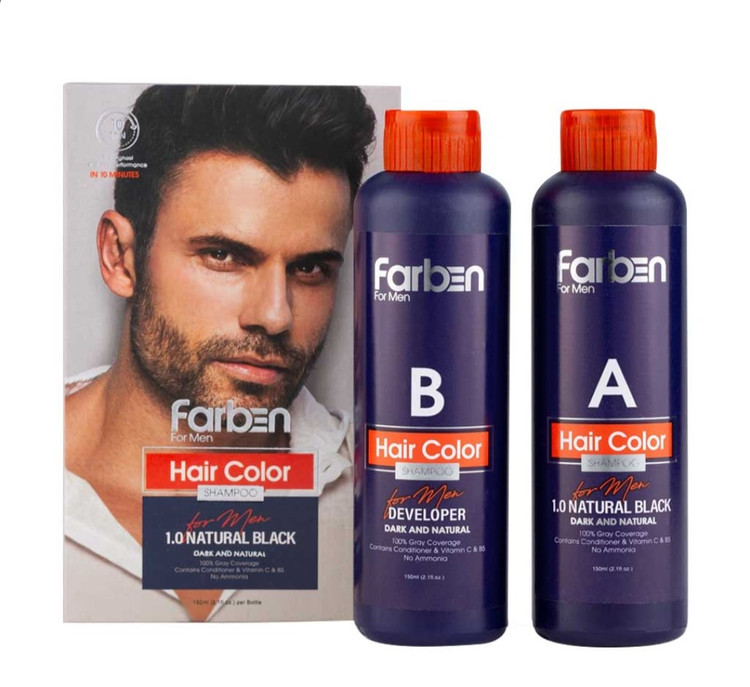 شامپو رنگ مو مردانه دو قلوی فاربن در عرض ده دقیقه با موهای سفید خود خداحافظی کنید شماره رنگ 1.0 مشکی مدت زمان ماندگاری 18 شستشو پوشش 100% موهای سفید