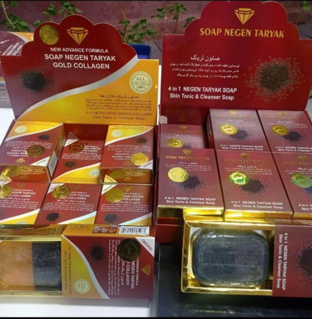 این صابون لطیف کننده و ترمیم کننده و عمیقاپاک کننده است و جوش های سر سیاه و خال های ریز رو ناپدید میکند این صابون جوان کننده و شاداب کننده پوست است و از پیری زود رس جلوگیری میکند کلاژن طلا پاک کننده و سفید کننده پوست مرطوب کننده و اثر تسکین پوست