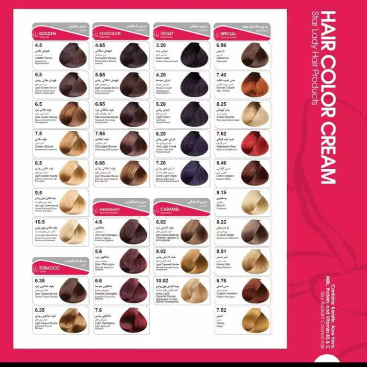 رنگ موی با کیفیت مارک استار لیدی حجم 120 میل دارای مواد کراتین برای موها رنگ موی استار لیدی با آمونیاک خیلی کم میباشد حاوی روغن آرگان،روغن زیتون ، روغن جوجوبا ،روغن ماکادمیا میباشد آبرسان و جلوگیری از خشکی و موخوره حاوی کراتین ترمیم کننده بافت کراتین مو حفظ رطوبت مو و جلوگیری از خشکی و آسیب دیدگی