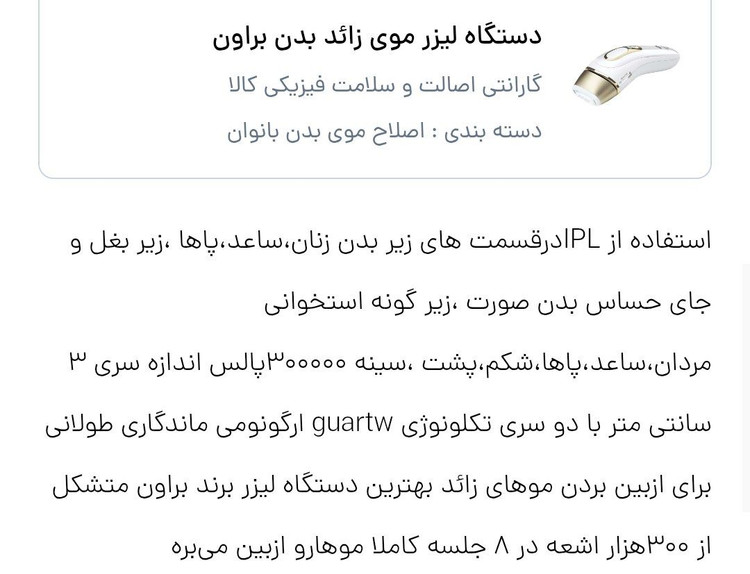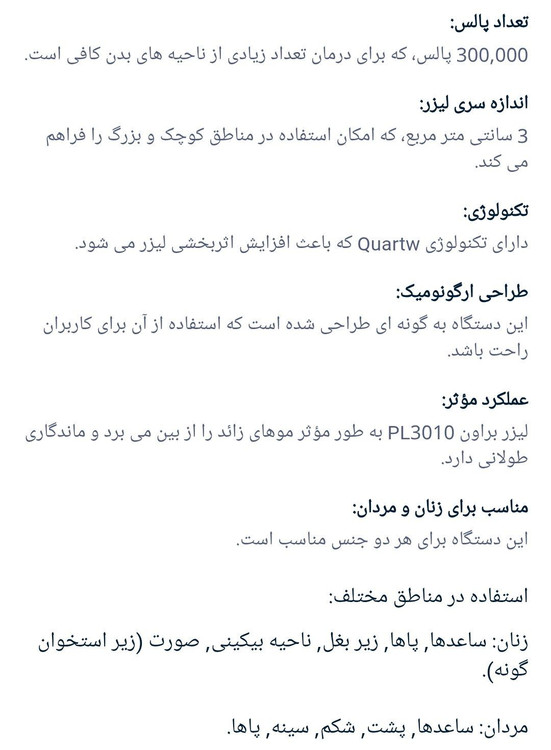 استفاده از IPLدرقسمت های زیر بدن زنان،ساعد،پاها ،زیر بغل و جای حساس بدن صورت ،زیر گونه استخوانی مردان،ساعد،پاها،شکم،پشت ،سینه ۳۰۰۰۰۰پالس اندازه سری ۳ سانتی متر با دو سری تکلونوژی guartw ارگونومی ماندگاری طولانی برای ازبین بردن موهای زائد بهترین دستگاه لیزر برند براون متشکل از ۳۰۰هزار اشعه در ۸ جلسه کاملا موهارو ازبین میبره